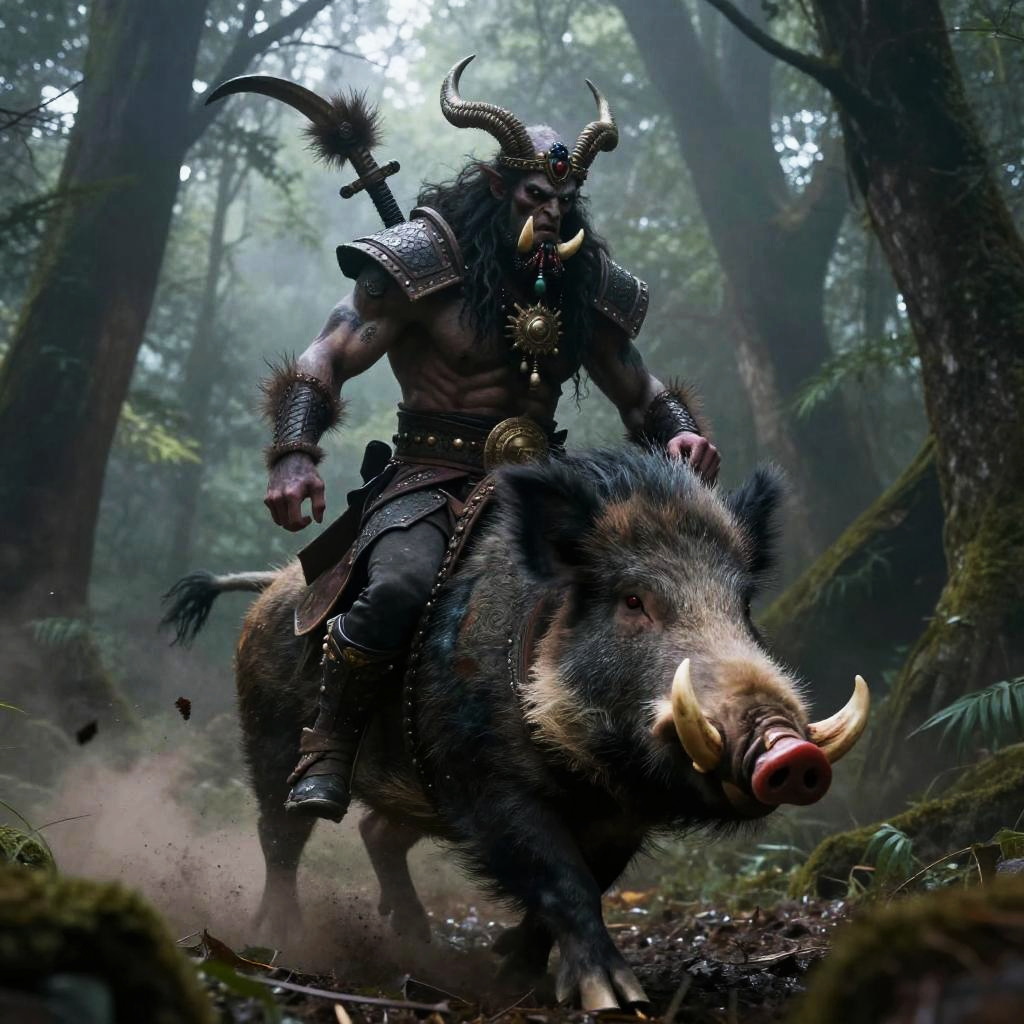 Malacath, god of the cursed and outcast orcs, portrayed as a powerful deity with sharp tusks and glowing eyes, wearing warpaint and tribal accessories, riding a giant boar through a dense, misty forest, ethereal atmosphere with dark fantasy elements and dynamic motion.
