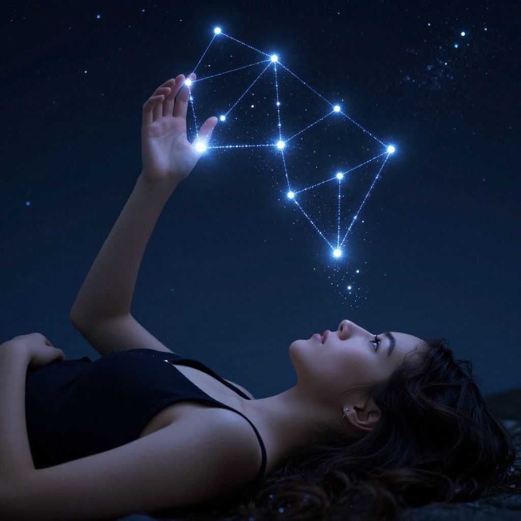 Photograph of a young woman with wavy dark brown hair lying on her back in a dark blue, starry night sky. She is wearing a black, sleeveless top and gazes upward at a constellation she is tracing with her right hand. The constellation, illuminated with bright white dots connected by dotted lines, forms a geometric pattern above her head. Her skin is fair, and her expression is serene and contemplative. The background is a deep, star-filled night sky, enhancing the celestial theme. The lighting emphasizes the constellation and her face, casting soft shadows.