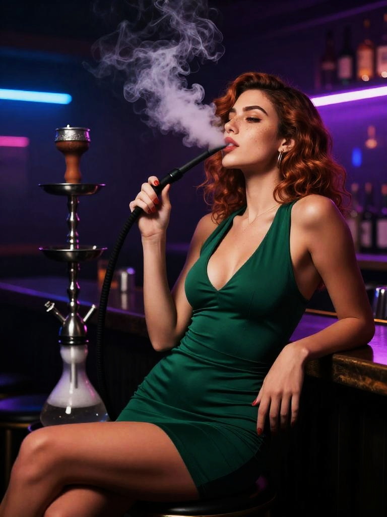 Woman smoking shisha, glamorous nightlife scene, chic woman with copper waves and freckled cheeks lounging at a bar counter, holding a long shisha hose with fragrant smoke swirling around her face, wearing emerald green bodycon dress with deep neckline, neon-lit club interior with soft purple and blue ambient lights with blurred bottles on the shelves, cinematic moody lighting, sharp focus, highly detailed, atmospheric nightlife photography