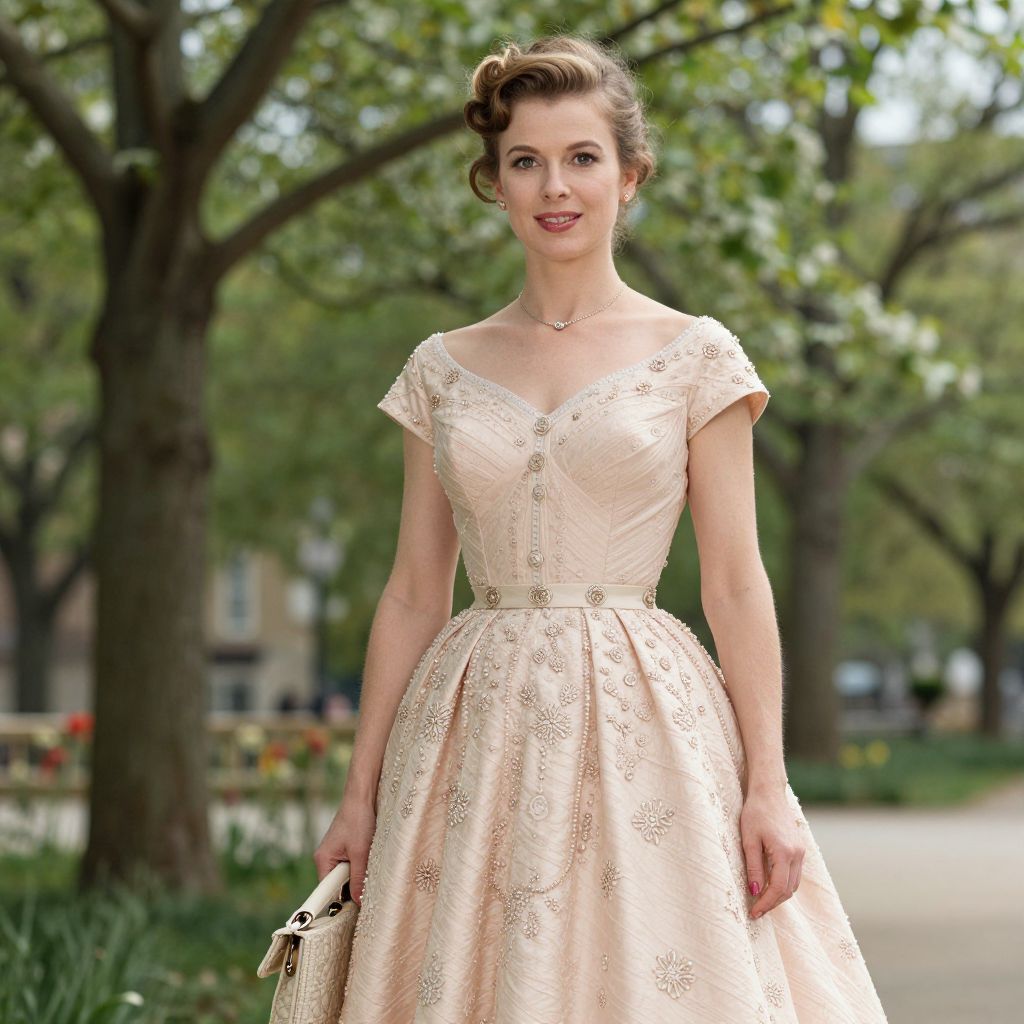 Elegantly poised woman in a vintage-inspired Dior gown, featuring a soft blush hue, intricate embellishments, and a chic updo, captured in a timeless spring-summer 1950 setting by Norman Parkinson, as featured in Chic n Cheap Living.