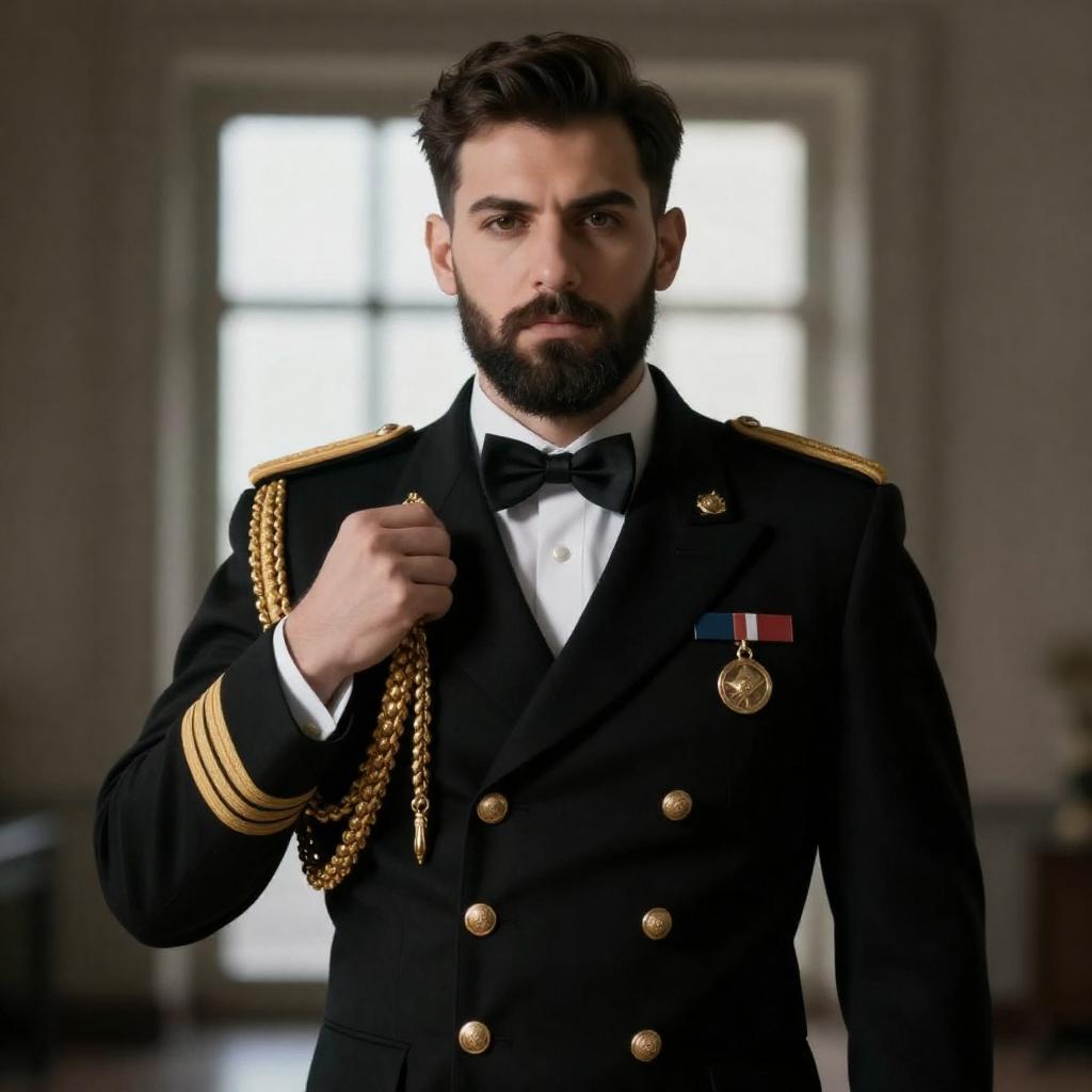 Photograph of a serious-looking man with short dark hair and a trimmed beard, wearing a white military uniform with black epaulettes and gold stripes. He has a focused expression and is slightly tilted to the right. The background is blurred with green and gray tones, suggesting an outdoor setting.