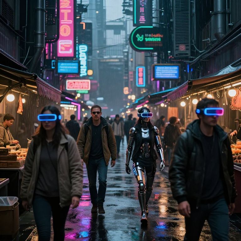 Futuristic cyberpunk dystopian city street scene, neon signs flickering above crowded markets, people wearing augmented reality glasses and cybernetic enhancements, chrome and metal architecture, gritty textures, wet pavement reflecting colorful lights, rainy ambiance