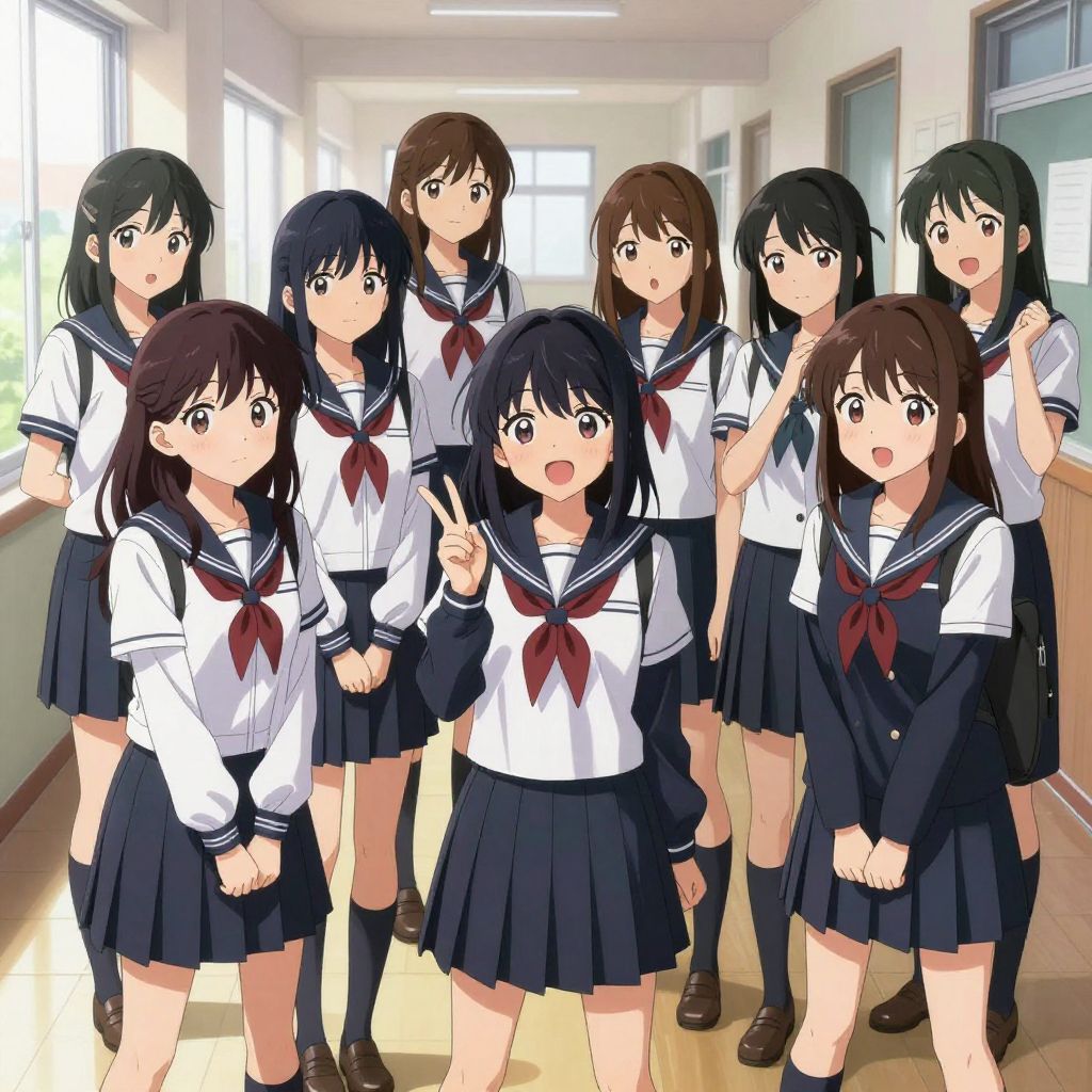 A vibrant illustration of ten anime-style female students wearing traditional Japanese school uniforms, including sailor outfits and blazers with skirts. The characters exhibit diverse hairstyles and hair colors, posed together in a bright school hallway with expressive facial expressions, conveying a lively school atmosphere.