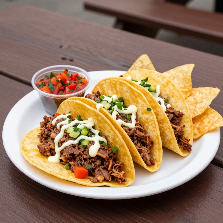 Renaissance Art 3 hardshell tacos on a plate with salsa and chips, outside on a picnic table, UHD, Super realistic, high level of detail, bold rich color palette,
