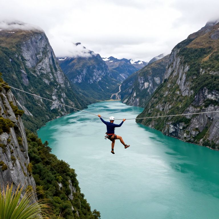 Adventurous highliner gracefully balances on a tightrope suspended above a serene turquoise fjord, surrounded by lush green cliffs in New Zealand's breathtaking landscape.