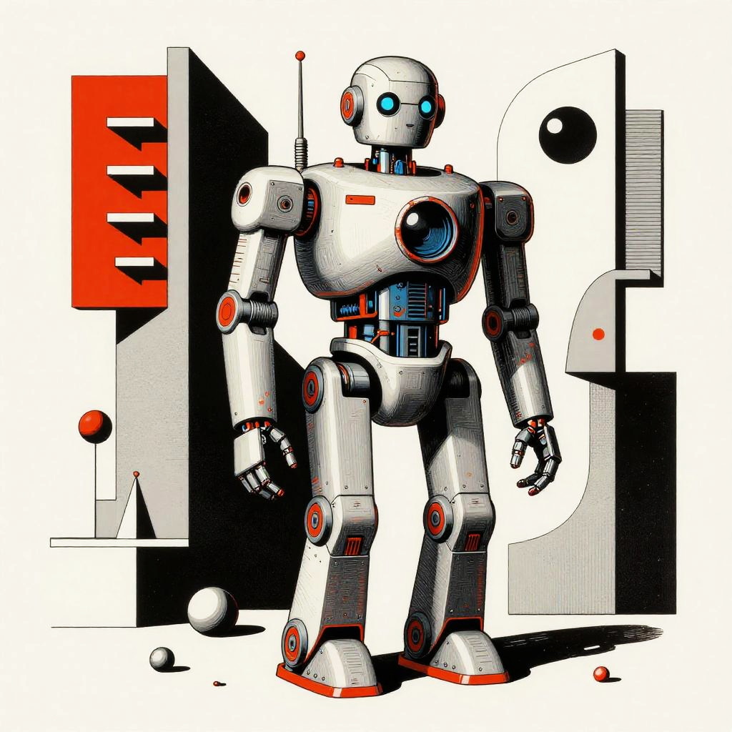 Brutalism illustration of a futuristic robot by Le Corbusier, Alison and Peter Smithson, high detail, pop art influences.