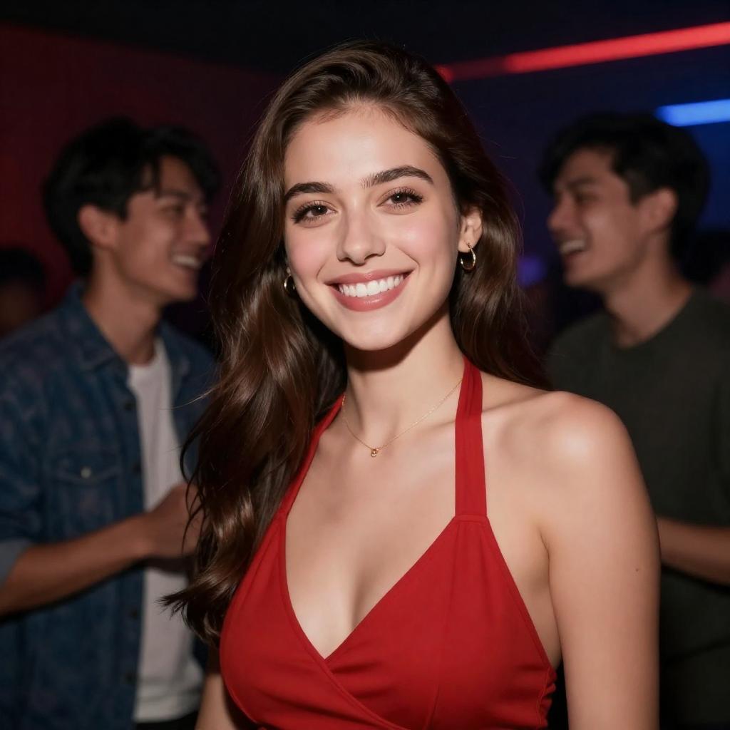 Photograph of a woman with long, wet, dark brown hair in a red halter dress, standing in a dimly lit nightclub. Red lighting, blurred background with several men in red shirts. Intense facial expression, looking to the side.