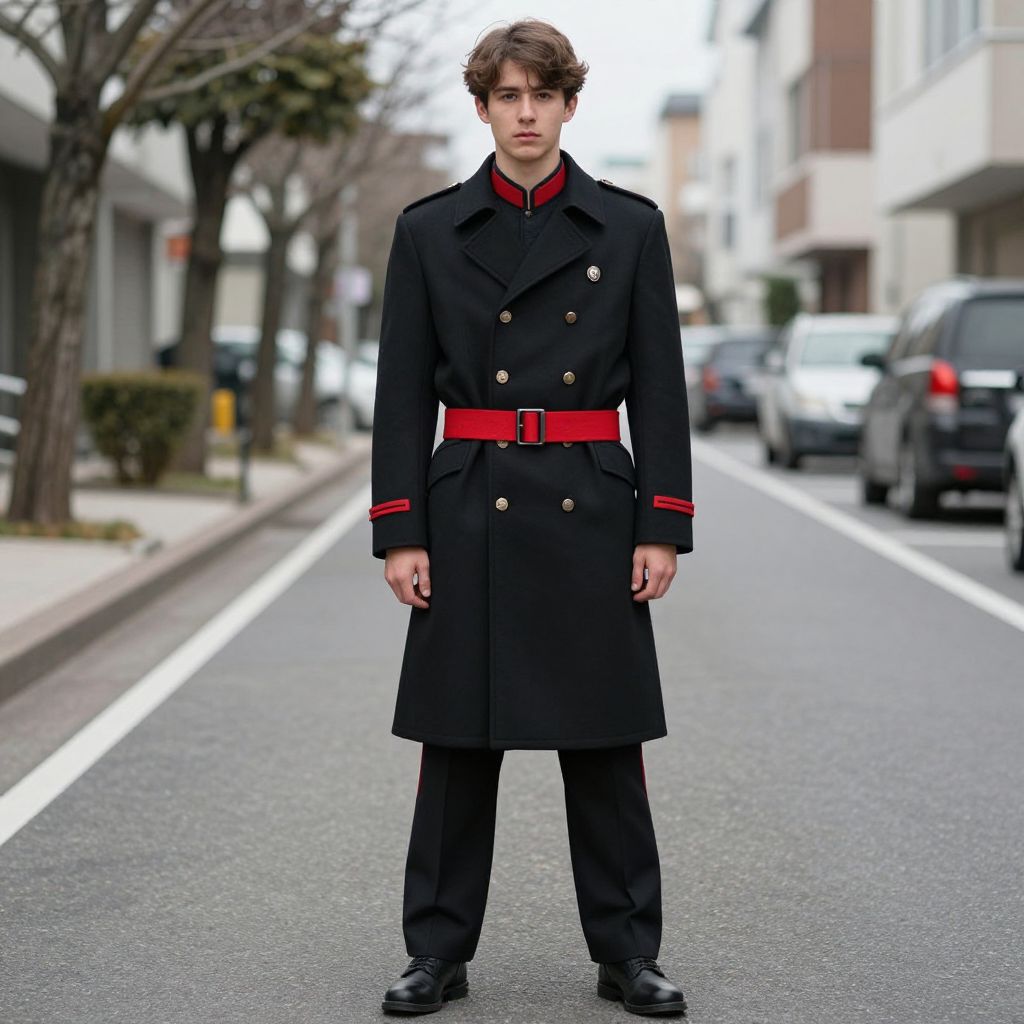 Shujin Academy Uniform Costume, male in a black coat and red belt standing in a street