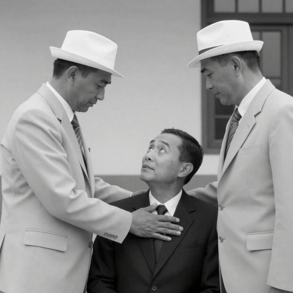 Black-and-white photograph of a family group. Centered man in a suit sits on a wooden chair, six women and three men standing behind him. Women in dresses, one in a coat, men in suits. Arched background, patterned floor. Formal attire, neutral expressions. Eight people total.
