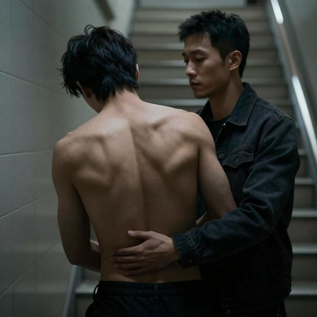 Photograph of a dimly lit, dramatic scene featuring a shirtless man with a muscular build and dark hair, being held by a man in a dark jacket. They stand in front of a tiled wall and a staircase with bright lights. The shirtless man's back is to the camera, while the other man faces him, creating a tense, intimate moment.