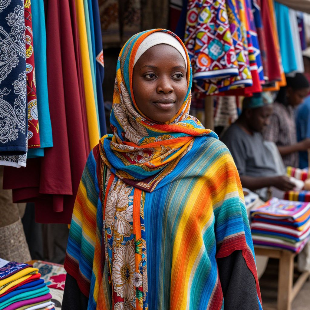 Photograph of a Black woman wearing a colorful, striped hijab and shawl, standing in a vibrant market with diverse, patterned fabrics in the