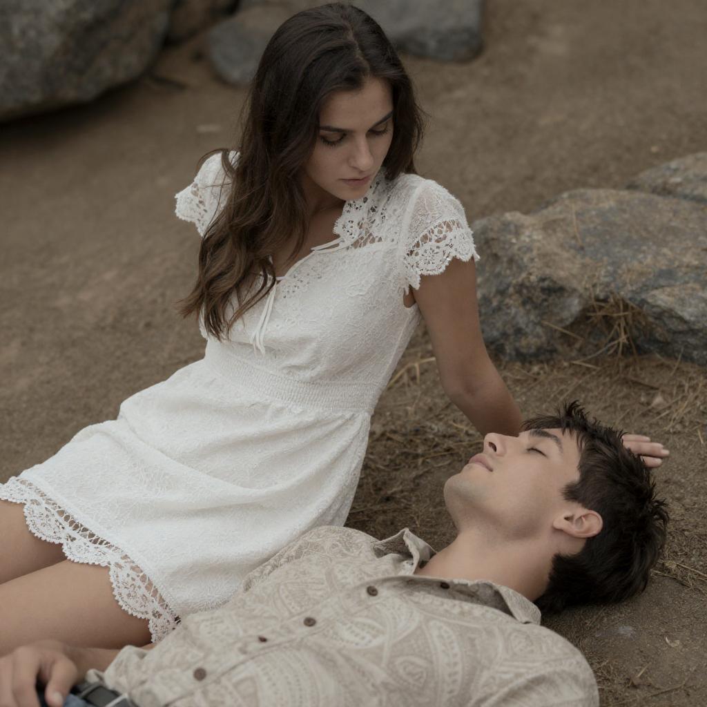 Black-and-white photograph of two people outdoors. Woman with long, dark hair, light shirt, and skirt sits beside man with short, light hair, floral shirt, lying in an open bag. Woman looks slightly to the right, man looks up at her. Both appear relaxed. Background includes dry grass and foliage. Woman's skirt is draped over her knees. Man's bag is partially visible in the lower left.