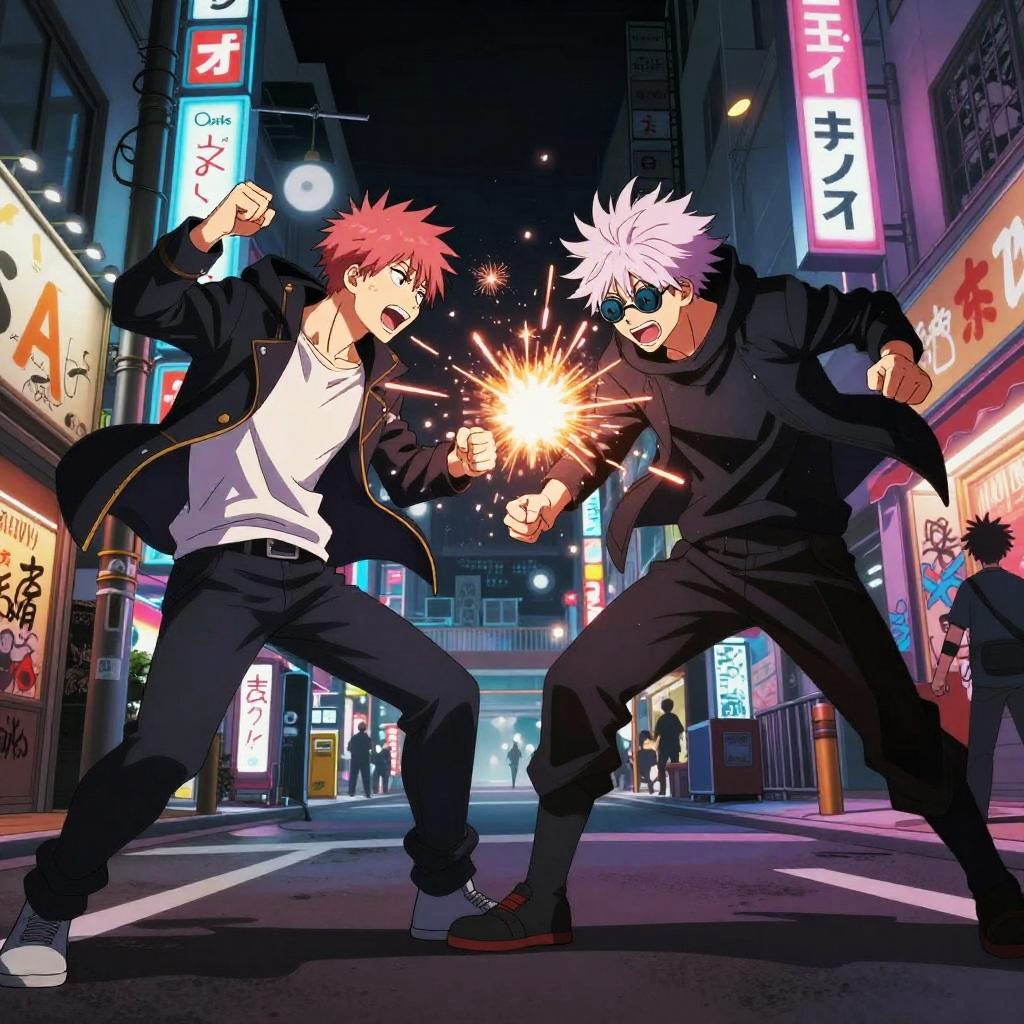Digital anime-style drawing of two spiky-haired, street-fighting males in a neon-lit, bustling Japanese city street at night, exchanging fiery punches