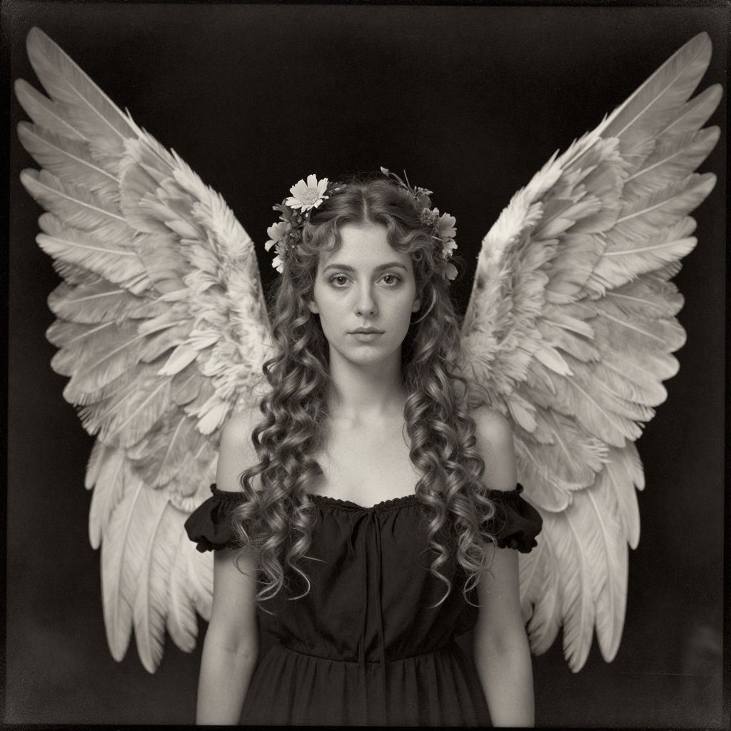 In this striking collodion photograph, a woman stands as the central figure, her face and shoulders filling the frame. Her hair, a mass of curls, cascades down her back, adorned with delicate flowers that add a touch of nature to her appearance. She wears a delicate, black, off-the-shoulder top that contrasts with her fair skin. The most striking feature is the pair of large, intricately detailed wings that extend from her back, their feathers meticulously rendered. These wings, with their soft, feathered texture, create a sense of ethereal beauty and transcendence. The background is a dark, textured surface that enhances the dramatic effect of the image, while the overall monochromatic color scheme adds a timeless quality. The composition is balanced, with the woman's face centered, drawing the viewer's attention directly to her expression and the wings that seem to envelop her, symbolizing a sense of flight and freedom.