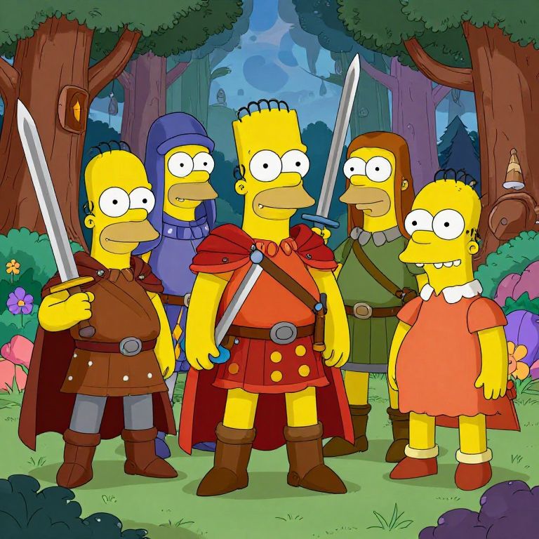 Custom Simpsons characters reimagined as futuristic sci-fi versions, neon colors and tech-inspired outfits, Springfield landmarks transformed into high-tech cityscape, expressive faces with animated gestures, blending traditional Simpsons look with cyberpunk aesthetics