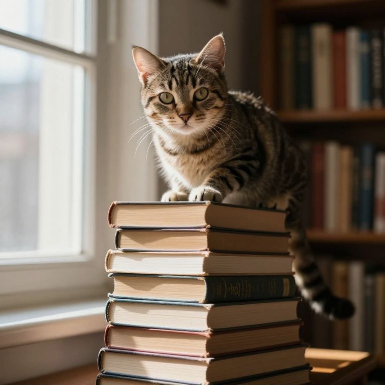 Curious tabby cat perched atop a towering pyramid of weathered books, its paw delicately resting on the topmost volume as sunlight filters through a nearby window, casting soft shadows in a cozy library setting.