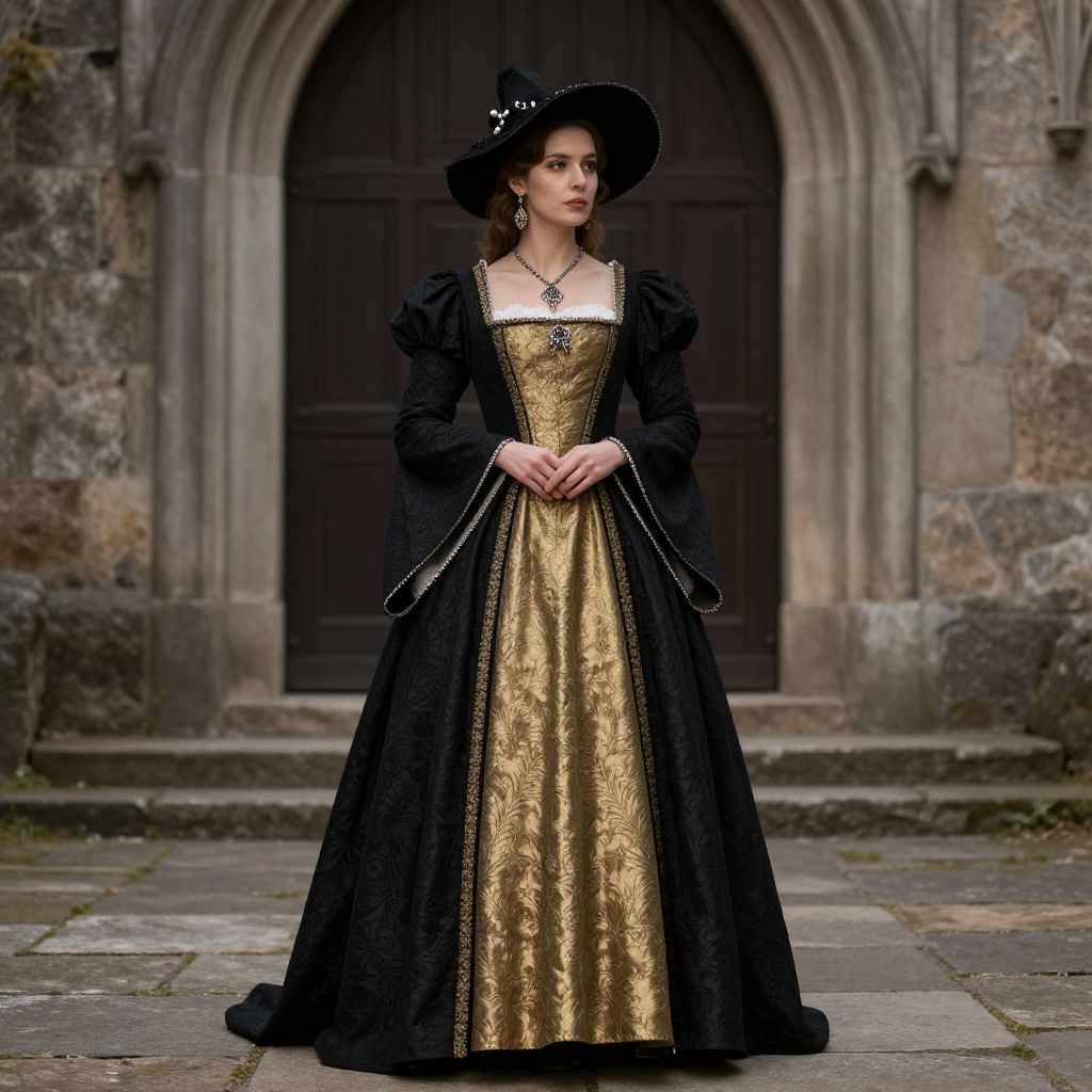 Gothic medieval clothes, woman in a black and gold dress and hat