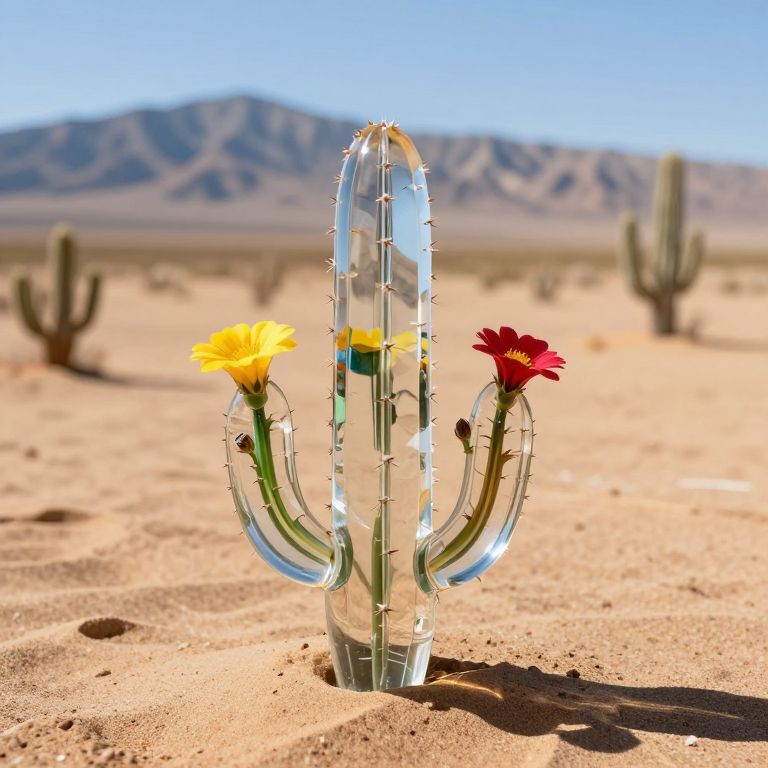 Glass cacti emerge from the desert sands, their transparent forms mirroring vibrant blooms and alternate realities against a backdrop of arid landscapes and distant mountains.