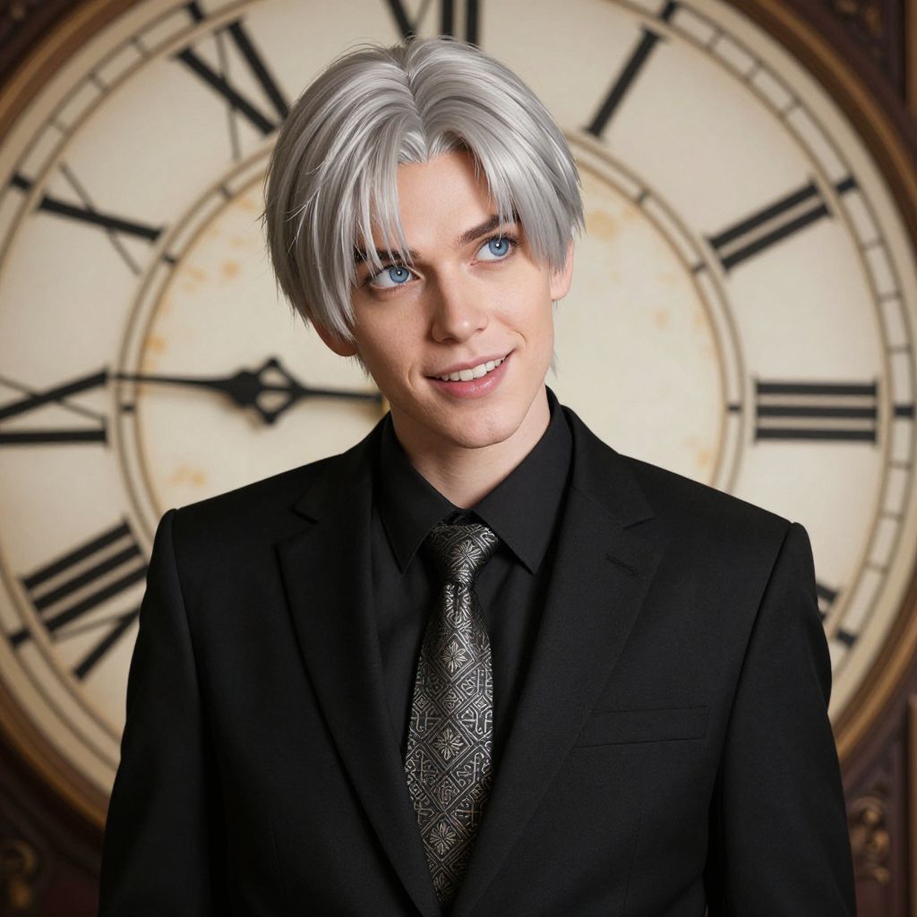 This is a digitally rendered photograph of a young man with striking silver hair and bright blue eyes. He is smiling directly at the camera, wearing a black suit with a black dress shirt and a patterned silver tie. The background features a large, antique-style clock with Roman numerals and black hands, slightly blurred to keep the focus on the man. The clock's face has a worn, vintage look with some discoloration. The overall style combines realistic digital portrait techniques with a slightly exaggerated, almost fantasy-like appearance for the hair and eyes. The lighting is even, highlighting the man's face and suit while casting soft shadows.