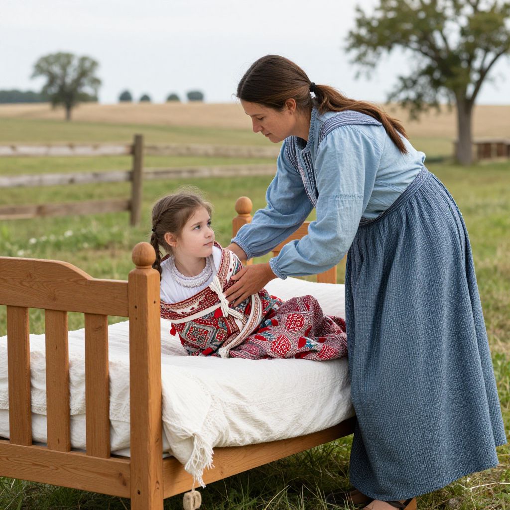 Amish woman gently tucks a young girl into a wooden bed outdoors, demonstrating the traditional practice of bundling in a rural Nebraska setting.