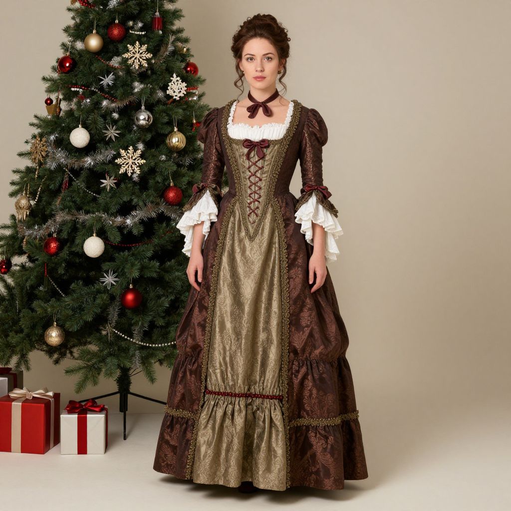 Photograph of a Caucasian woman with fair skin and dark brown hair in an updo, wearing a Victorian-style brown and gold brocade dress with white lace cuffs and a black ribbon at the collar. She stands in front of a decorated Christmas tree adorned with red, white, and gold ornaments and snowflakes. The tree is flanked by red and white wrapped gifts. The background is a plain, light beige studio setting. The woman's expression is neutral, and she stands with her hands by her sides.