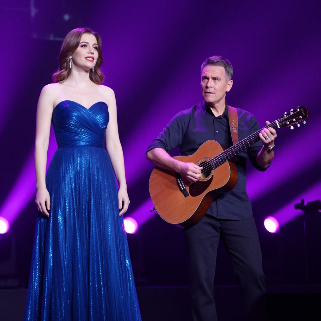 Photograph of a stage performance featuring a woman and a man. The woman, with fair skin and shoulder-length brown hair, wears a strapless, sparkling blue gown that flares out. She stands to the left, looking slightly upward. The man, with short gray hair and fair skin, wears a black button-up shirt and black pants, playing an acoustic guitar. He stands to the right, focused on his instrument. The background is illuminated with purple and pink stage lights, creating a vibrant, theatrical atmosphere. The woman's gown contrasts with the man's dark attire, emphasizing their roles in the performance.