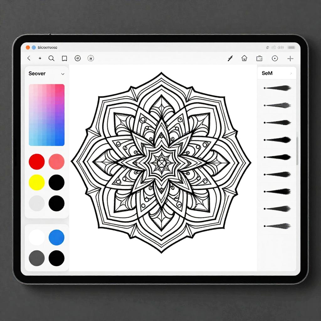 High-tech coloring pages generator producing geometric and mandala patterns on a digital canvas, futuristic minimalistic interface with intuitive controls, floating color swatches and brush options, cool toned environment emphasizing creativity and design precision