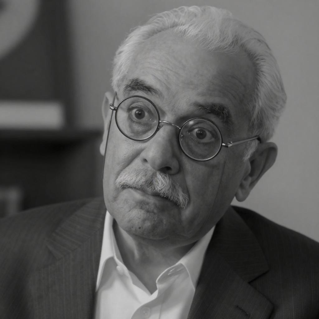 Black and white close-up portrait of an elderly man with white hair, a thin mustache, and round glasses with thin wires hanging from the frames. He is wearing a pinstripe suit and a white shirt. The man's head is tilted slightly to the right, with wide, slightly alarmed eyes. The background is blurred and indistinct.