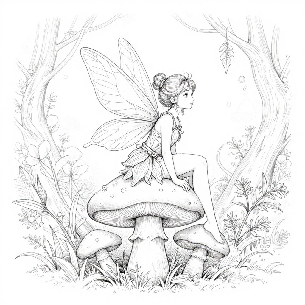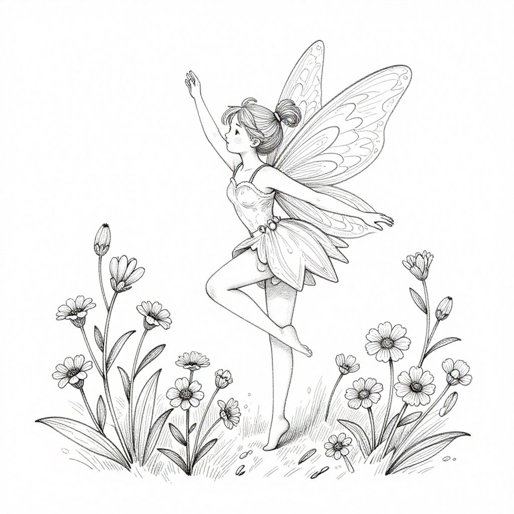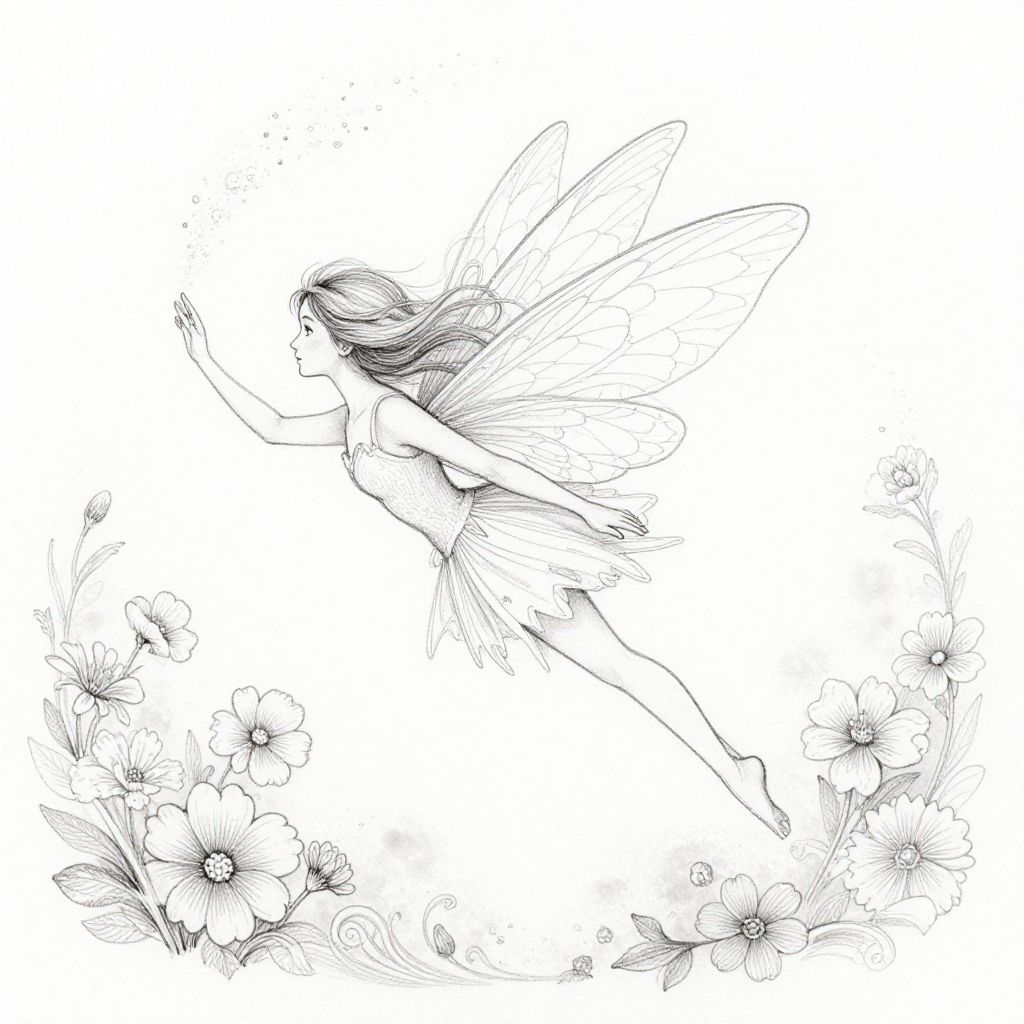 Fairy line drawing featuring a slender fairy in mid-flight, flowing hair and ethereal wings outlined with fine lines, surrounded by sparkling fairy dust and floral motifs, monochrome, soft and elegant pen-and-ink artistry for a magical atmosphere