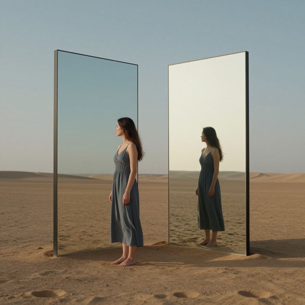 In a desolate desert, two mirrors stand side by side, each reflecting a woman gazing into the vast horizon, creating an illusion of infinite parallel worlds converging in a single, surreal moment.