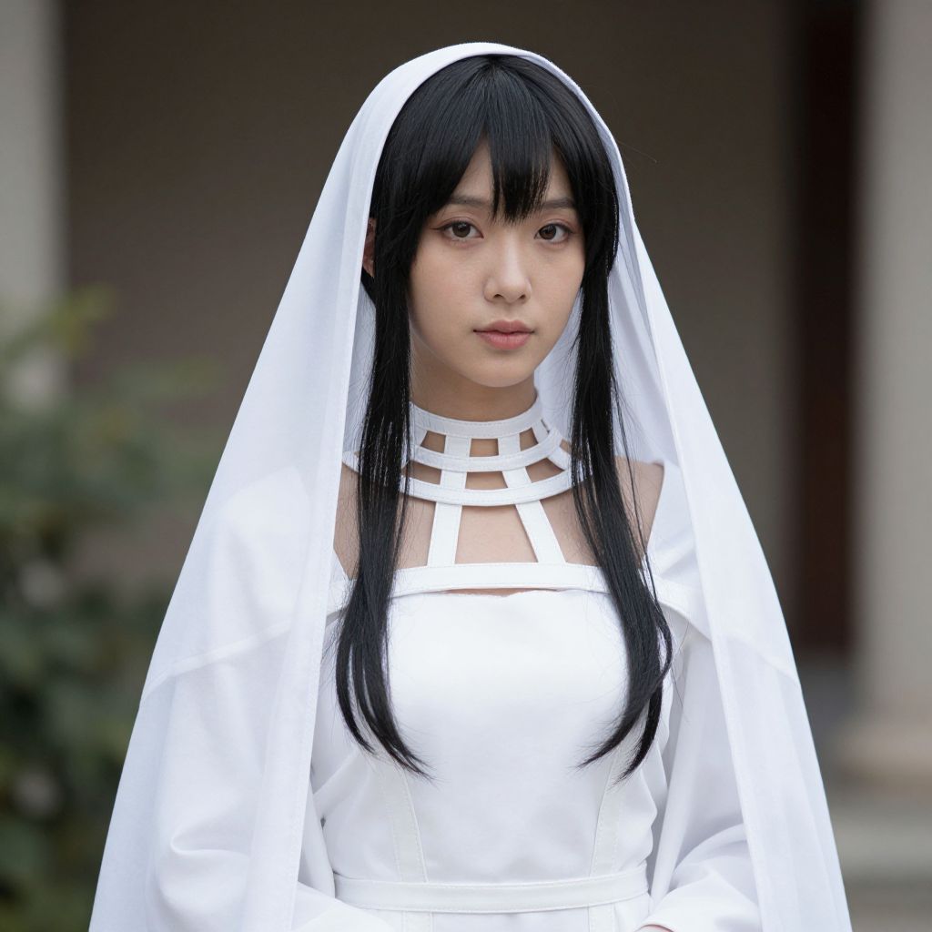 Photograph of an Asian woman in a white nun outfit with a veil, long black hair, and a geometric collar, standing outdoors.