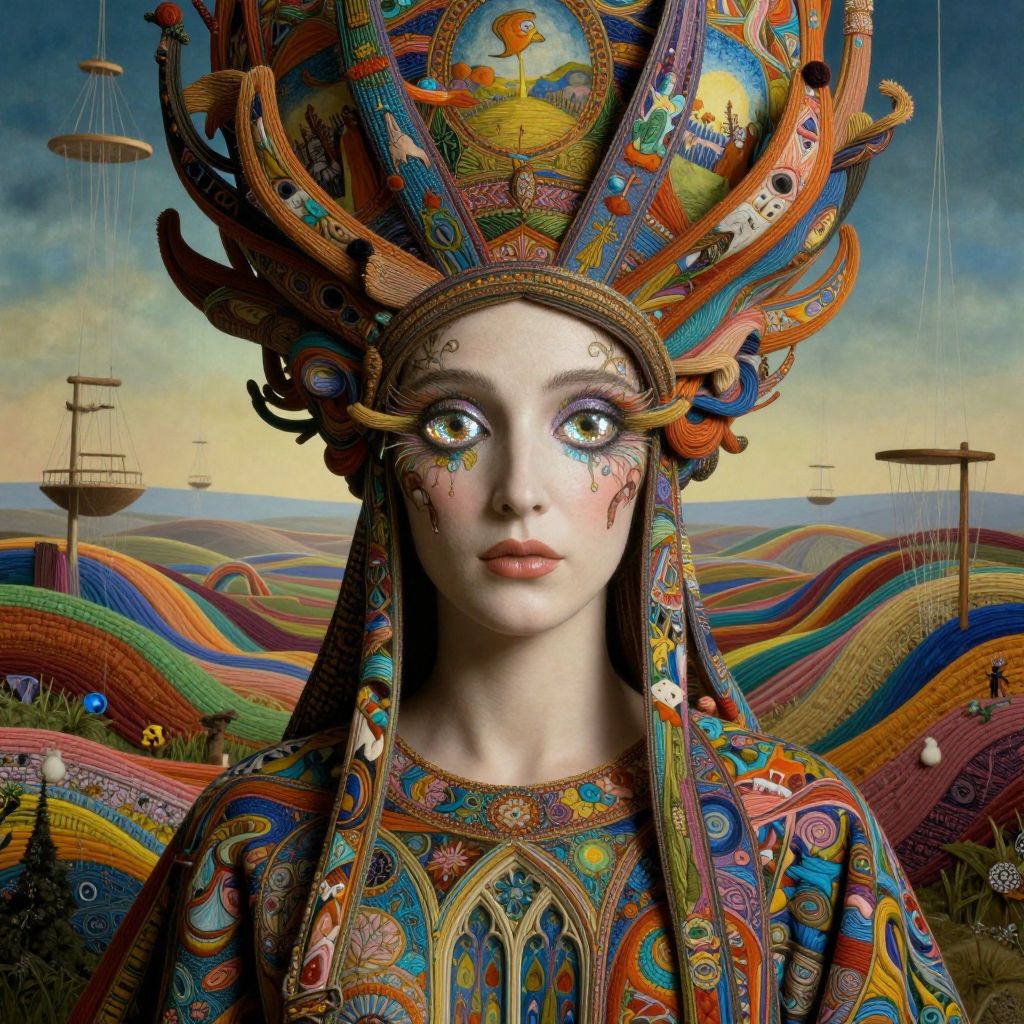 A surreal close-up of a woman depicted as the goddess of woven realms, blending the dreamlike surrealism of Salvador Dalí with the intricate, decorative artistry of William Morris, Her head is adorned with an enormous crown resembling an endless, interwoven tapestry, its threads shifting in color and texture as if alive, Each thread reveals miniature vignettes of mythical creatures and surreal landscapes, blending seamlessly into the endless patterns, Her eyes are replaced with shimmering mirrors reflecting the infinite designs of the crown, evoking an otherworldly presence, Her gown flows like liquid fabric, covered in shifting, kaleidoscopic floral patterns that blend Gothic arches with surreal, melting forms, The background features a surreal landscape of endless rolling hills made entirely of colorful woven fabrics, with floating looms creating the scene in real-time, Soft, ethereal lighting enhances the surreal textures, casting radiant glows on the intricate threads and folds, Rendered in 8K ultra-HD, the mesmerizing interplay of surrealism and intricate medieval-inspired patterns is flawlessly captured