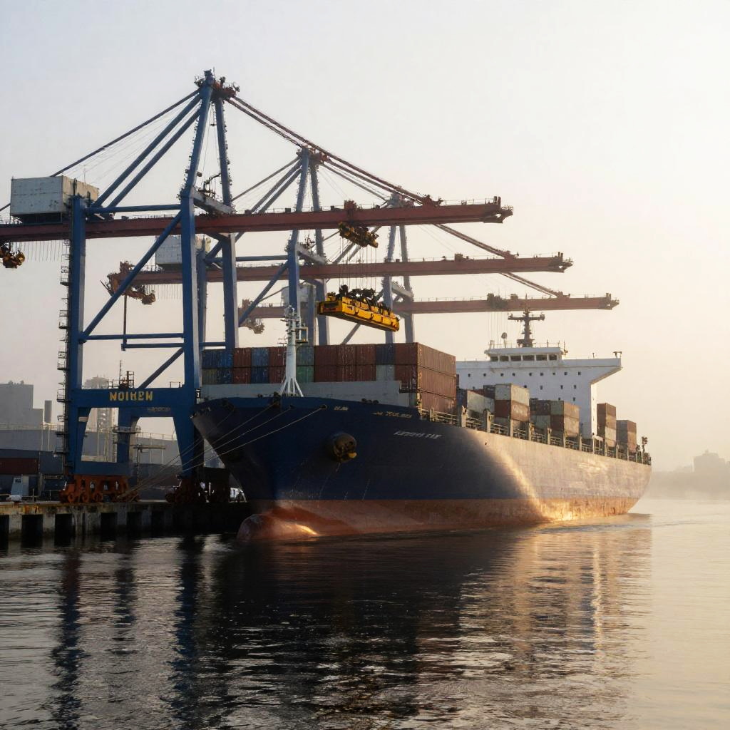 A detailed shot of logistics industry machinery, including a tractor-trailer and a container crane, operating in sync in a coastal logistics hub, with ships docked nearby and cargo being transferred between vehicles and vessels.