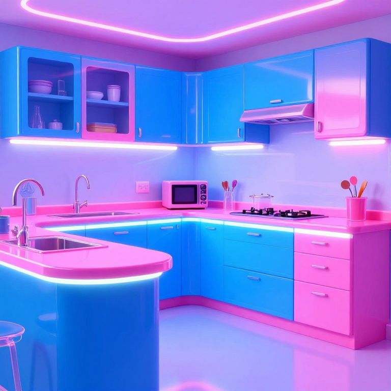 Y2K kitchen interior featuring colorful plastic cabinets in bright blues and pinks, curved counters with a high-gloss finish, futuristic lighting with glowing strips, and transparent furniture, highlighting the playful and bold technological optimism of the early 2000s.