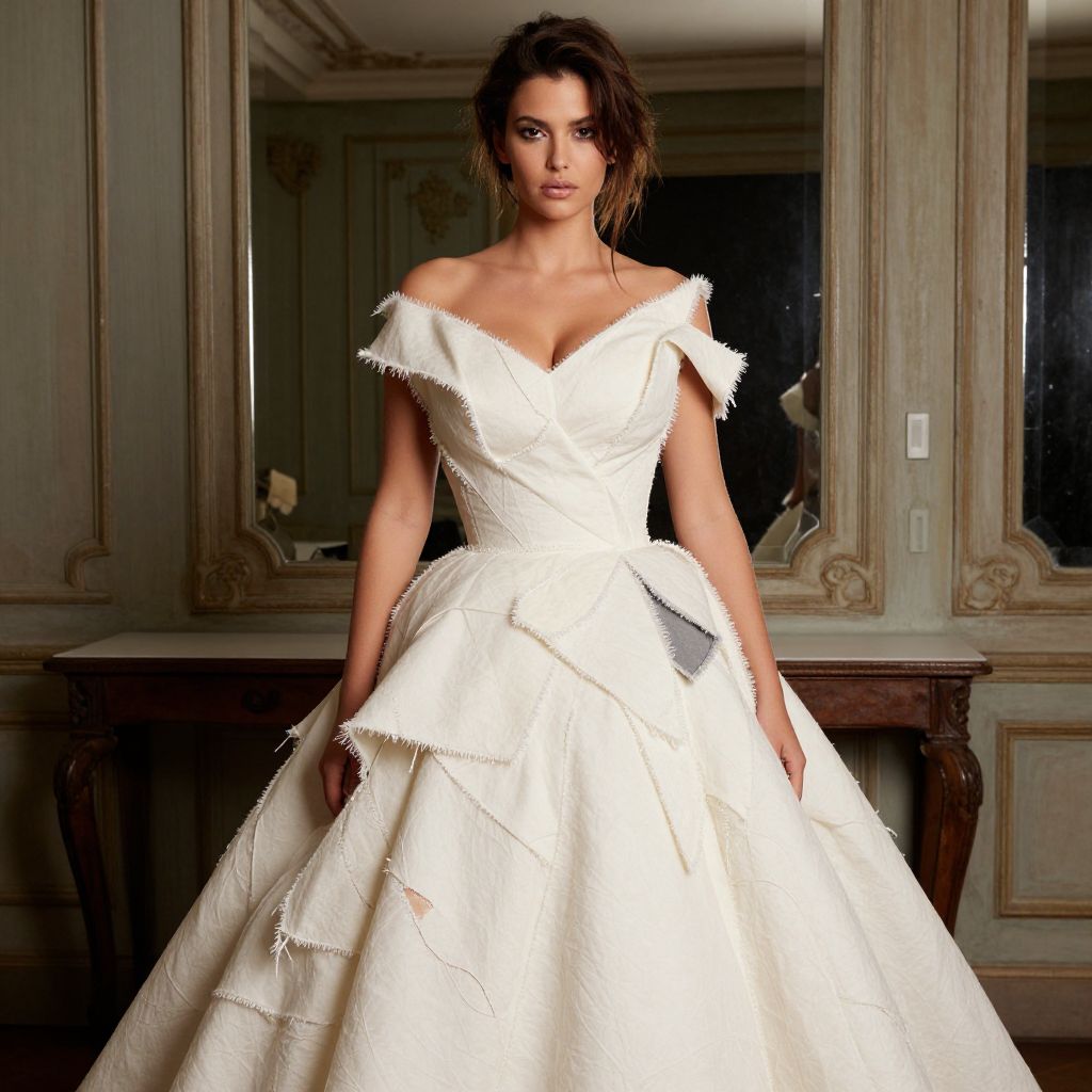 A realistic fashion shot of a bold woman with dark eyes, defined jawline, and a slightly tousled hairstyle, in a deconstructed ball gown with asymmetrical raw edges, standing against a vintage mirror background in a high-end fashion atelier; the gown has visible patches of raw wool and fabric, blending classic ballgown elegance with a rebellious, modern deconstruction style.. The woman has big tits and cute face