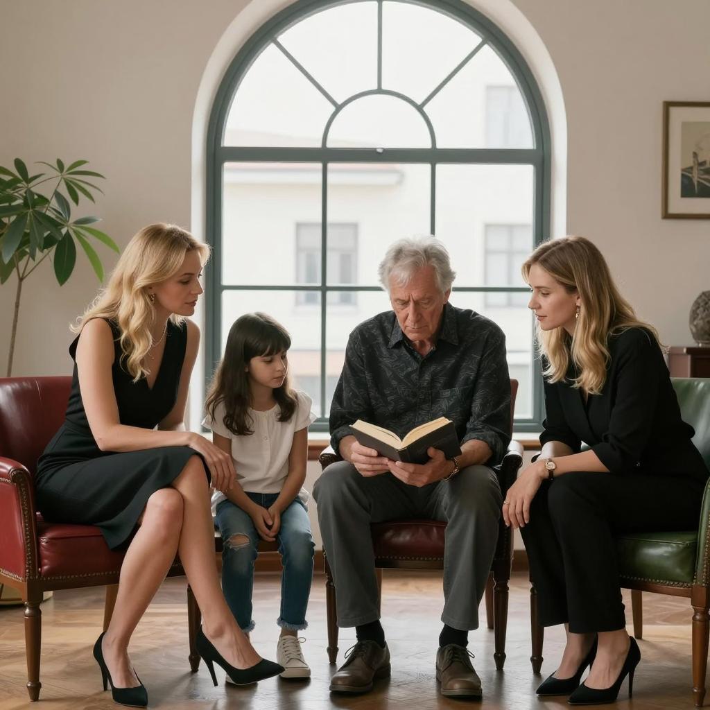 Three people sitting closely on a couch, engaged in reading a book. An elderly woman with blonde hair, wearing a black top and a striped ribbon scarf, a middle-aged man with dark hair dressed in a striped sweater and tie, and a young blonde woman in a white blouse with patterned trim. They are smiling warmly in a cozy indoor setting with blinds in the background.