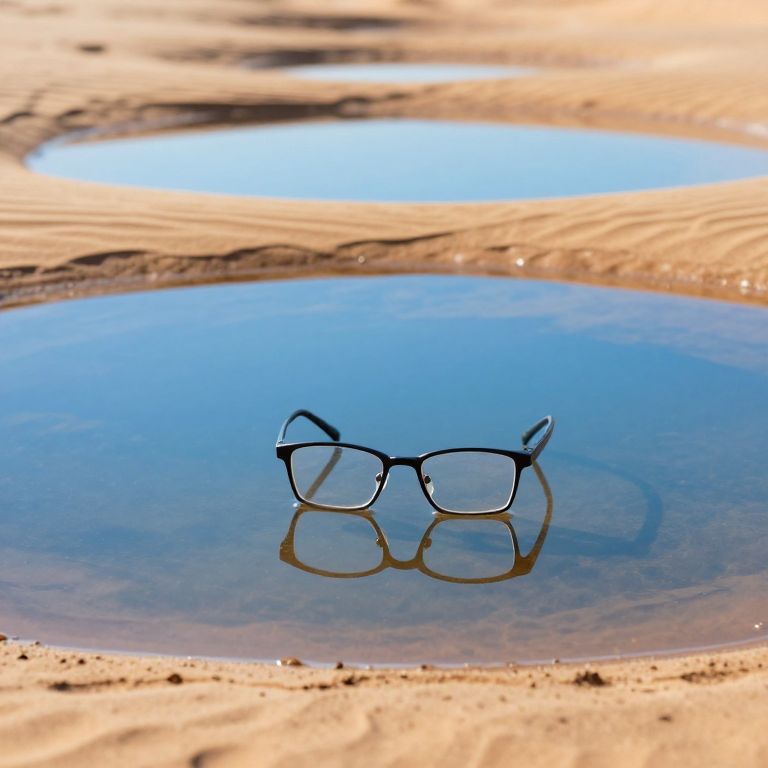 Desert sands cradle a series of tranquil pools reflecting the azure sky, where a pair of eyeglasses rests perfectly balanced atop the water's surface, mirroring its serene surroundings.
