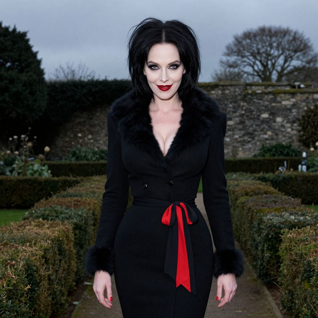A highly detailed realistic photograph of Cruella de Vil in her iconic 1960s costume, wearing a fur-lined black dress with a high collar, long sleeves, and a sharp tailcoat, styled with a dramatic red and black ribbon tied at the waist. The woman has sharp, angular features with a pale complexion, icy blue eyes, and a sharp, sly smile, standing in a cold, moonlit English countryside garden under a grey sky, with tall hedges and old stone walls in the background. The lighting is soft and moody, emphasizing the elegance and menace of her outfit.. The woman has big breasts and cute face