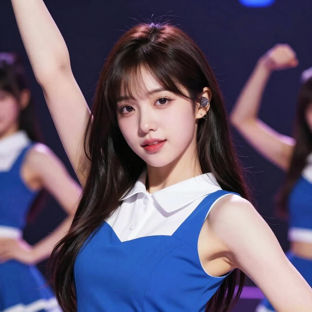 High-resolution image of a 28-year-old female idol with dark eyes and long dark hair, wearing a blue dress with a white collar, performing a dance on stage. The subject has beautiful, realistic skin and detailed facial features, captured in ultra-high definition and realistic style. Background shows additional dancers in matching costumes under stage lighting.