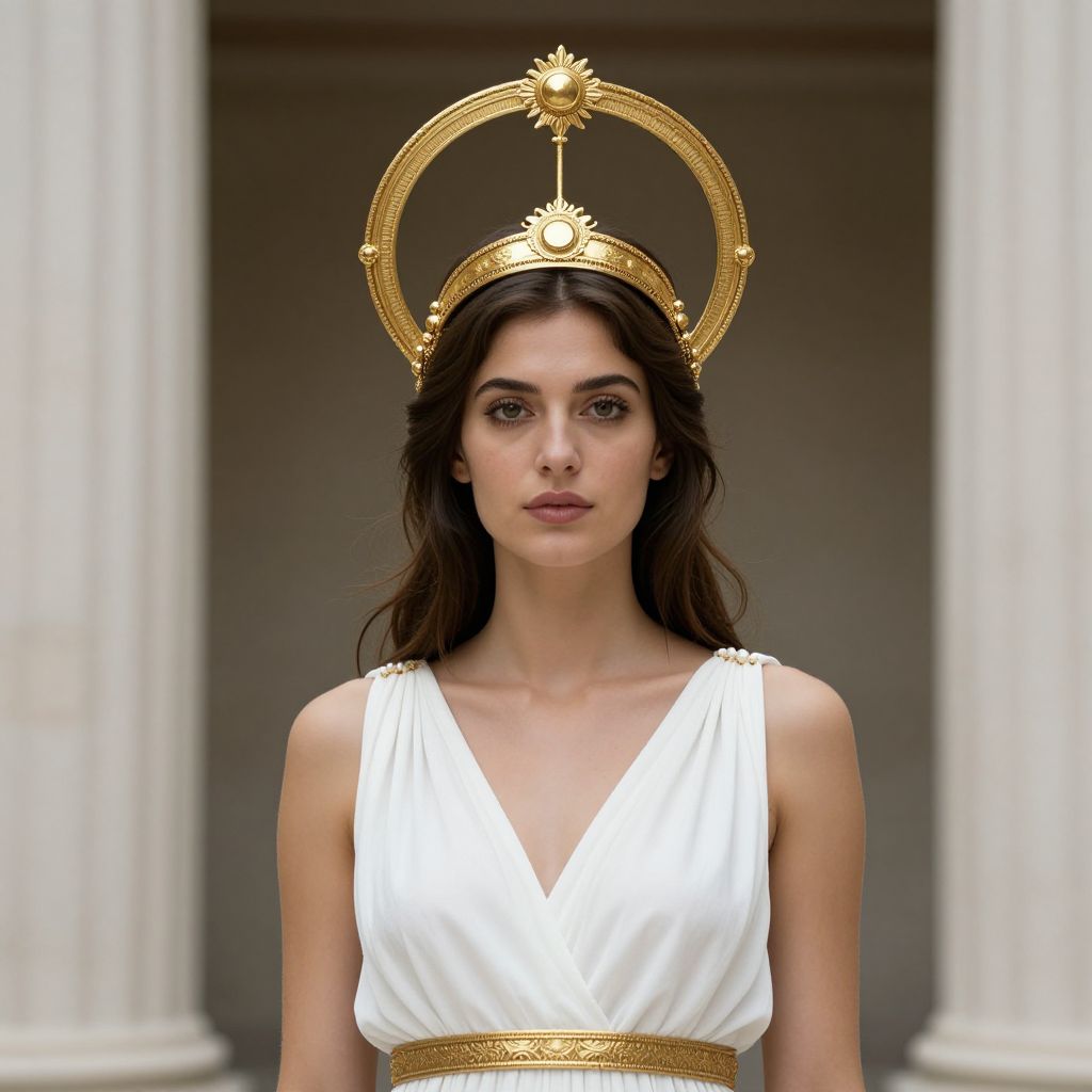 Photograph of a young woman with long, dark brown hair and fair skin, standing against a blurred background of white columns. She wears a white, sleeveless, V-neck dress with a gold, ornate, circular headpiece featuring a central sunburst design. Her expression is neutral, with slightly parted lips and direct gaze. The headpiece and dress contrast sharply, adding a regal, almost divine quality to her appearance. The lighting is soft, highlighting her serene and confident demeanor. The style is reminiscent of classical or ancient Greek fashion, with modern digital enhancements.