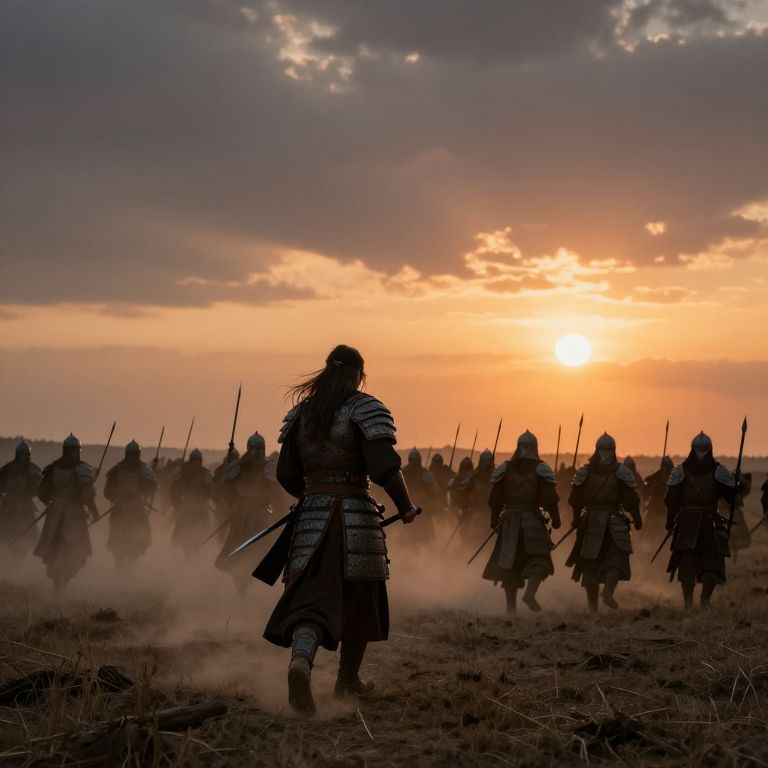 Epic scene of a warrior with long hair leading a charge of soldiers on a vast open plain, dramatic sunset in the background, dust clouds rising, realistic armor and weapon details, high contrast lighting