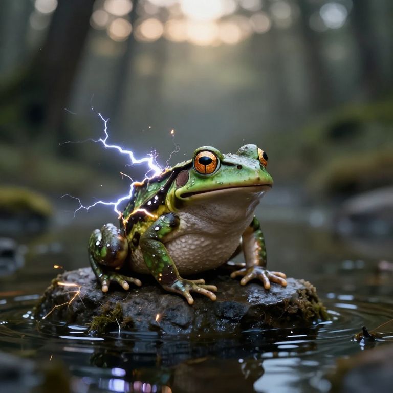 Consumerism electric frog, sparks, body out of sparks, small lightning around toad, lightnings, sparks in water, on stone in water, swamp, sunrise, forest, rpg fantasy style,