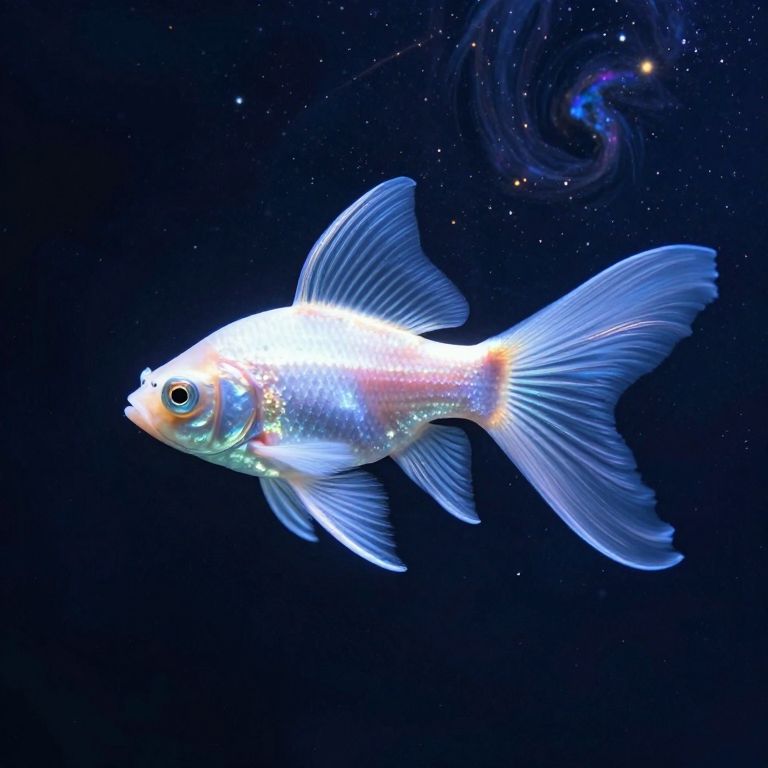 A luminous fish, bathed in ethereal light, swims through a cosmic void, its translucent fins shimmering like celestial dust against a backdrop of radiant sparks and swirling nebulae.
