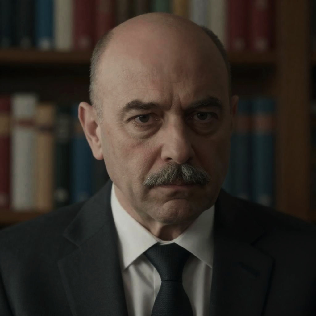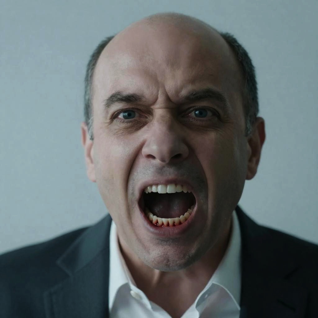 Close-up photograph of a middle-aged man with pale skin, balding with dark hair on the sides, screaming with his mouth open, showing blood-stained teeth. Blue-tinted background. Intense, wide-eyed expression. Wearing a dark suit with a white shirt.