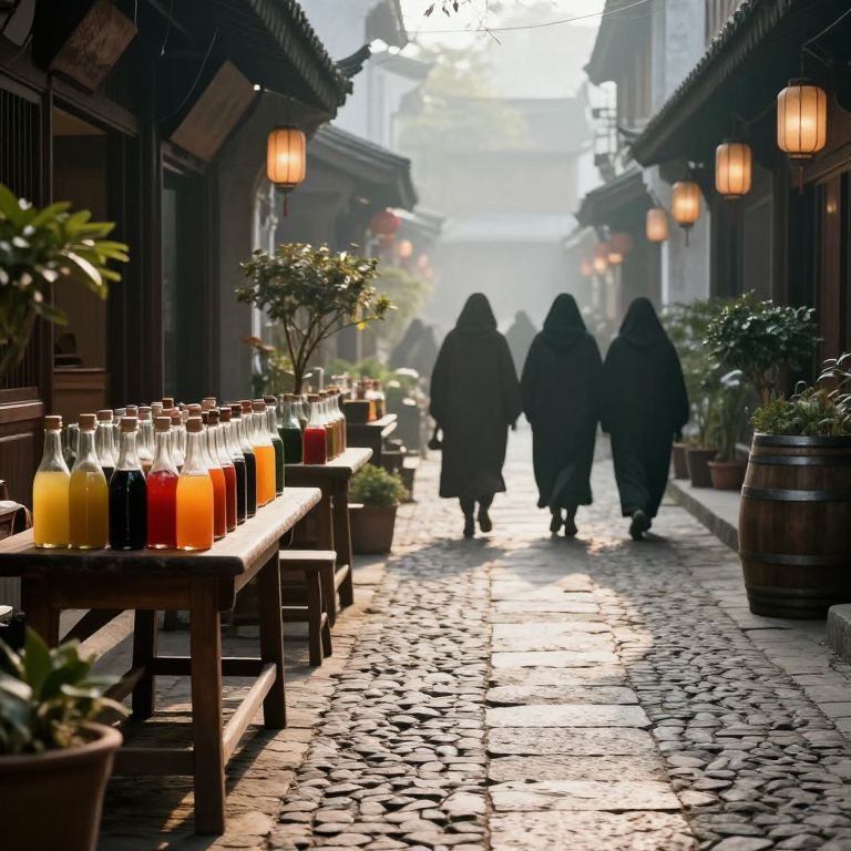 Sunlit cobblestone alleyway lined with rustic wooden tables displaying rows of glass bottles filled with colorful liquids, flanked by barrels and potted plants, as three cloaked figures walk away into the misty distance beneath hanging lanterns and traditional eaves.