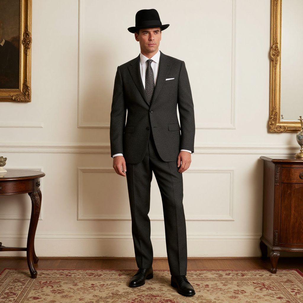 Manhattan Costume, man in a suit and hat standing in a room