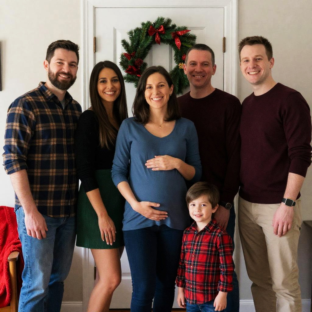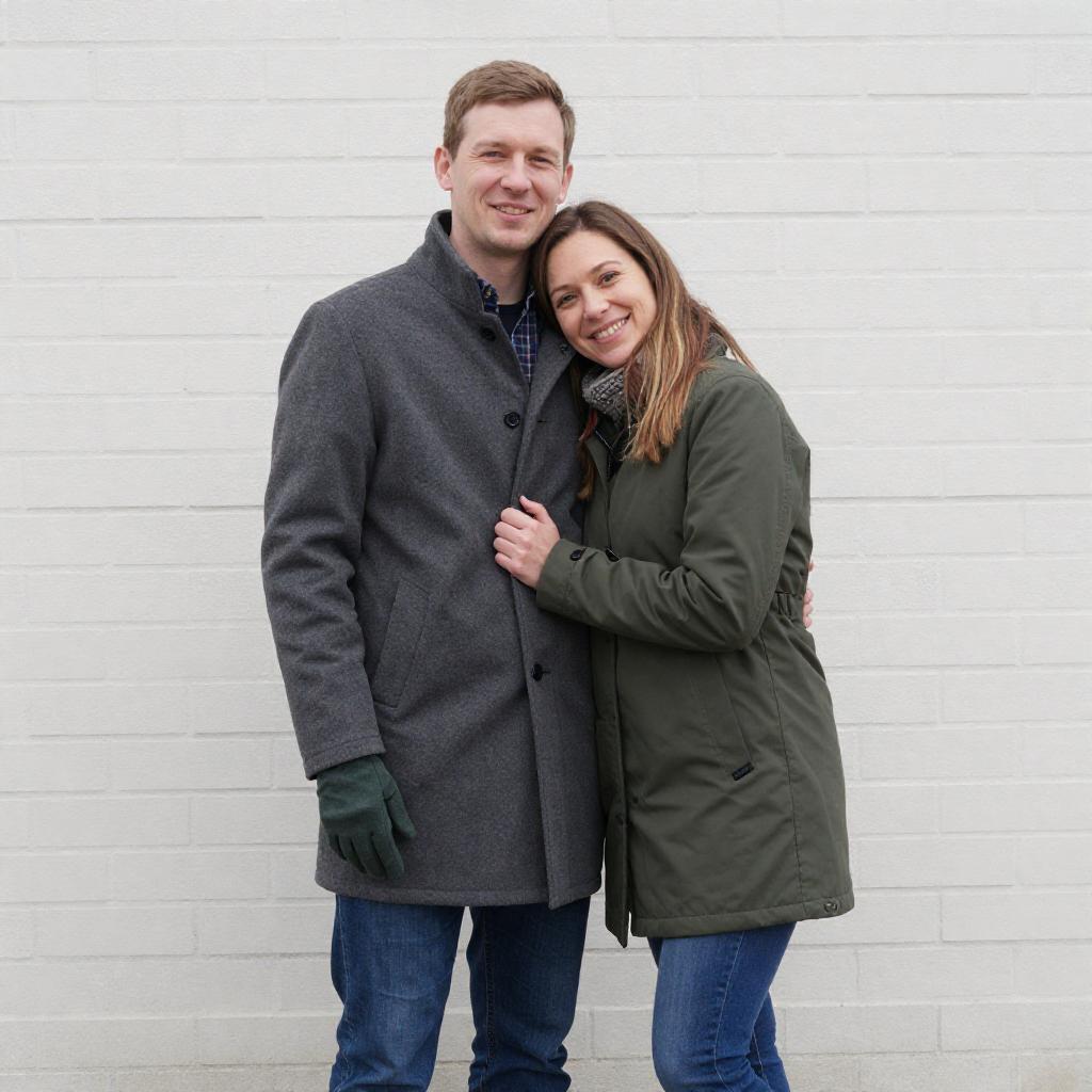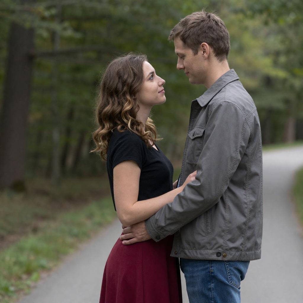 Photograph of a pregnant couple holding hands, standing in front of a green forest background. Woman with wavy brown hair, red dress, and black sleeves. Man with short brown hair, gray blazer, blue shirt, and jeans. Both looking at each other, neutral expressions. Light rainbow arc in background.