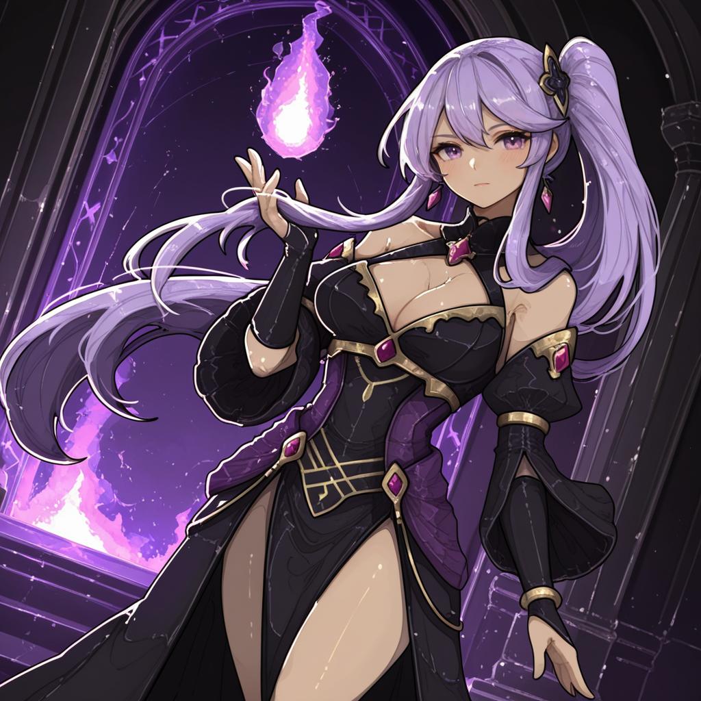 Digital illustration of a fantasy anime girl with very long purple hair styled in a high ponytail, purple eyes, wearing a black and purple ornate dress with gold accents. She has large earrings and is surrounded by a magical purple flame in a gothic arched window setting. The character exudes a mystical and powerful aura.