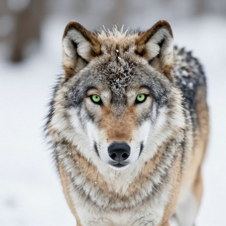 Photograph of a close-up, front-facing gray wolf with striking green eyes, standing in a snowy landscape. The wolf's thick fur is a mix of gray, brown, and white, with a snow-dusted head and pointed ears. The background is blurred but suggests a snowy forest. The wolf's intense gaze is directed at the camera, and its black nose contrasts with the white snow. The photograph emphasizes the wolf's majestic and powerful presence, with vivid colors and sharp details.