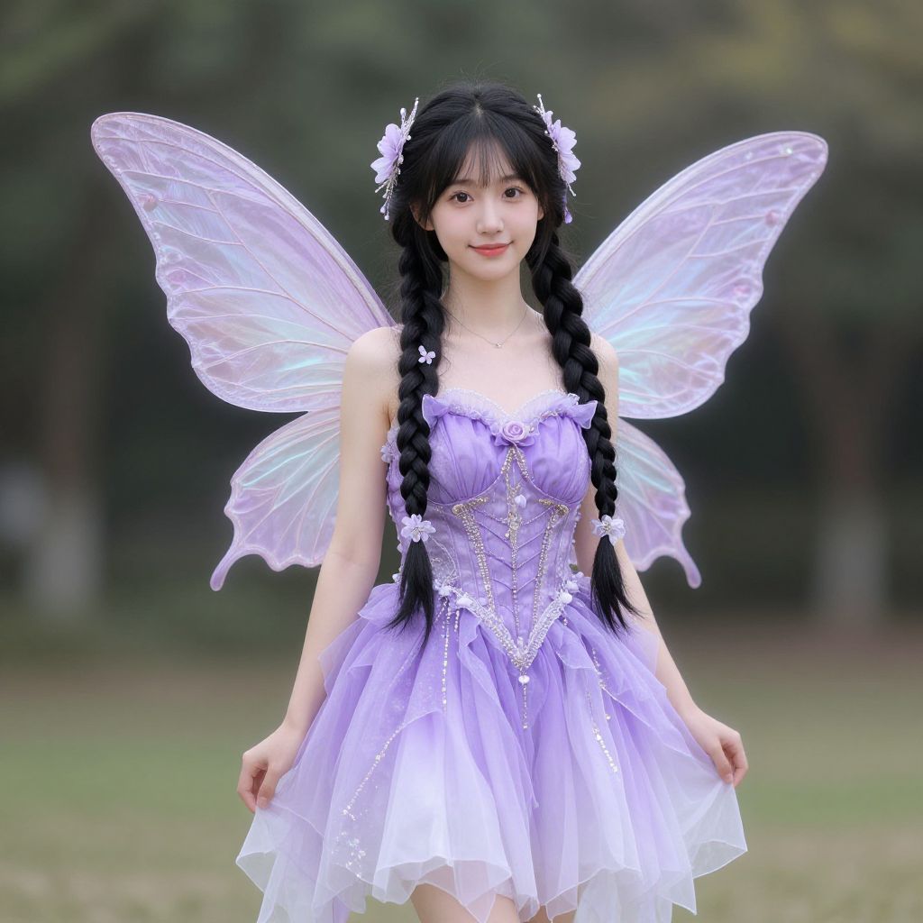Photograph of an East Asian woman with long black hair in two braids, wearing a light purple, strapless, fairy dress with intricate lace and beading. She has translucent, iridescent butterfly wings on her back and a white flower hairpiece. Her skin is fair, and she has a gentle smile. The background is a blurred, green outdoor setting with trees. The dress has a flared, tulle skirt and the wings are semi-transparent with a delicate, wing-like shape. The overall aesthetic is whimsical and fairy-tale inspired.